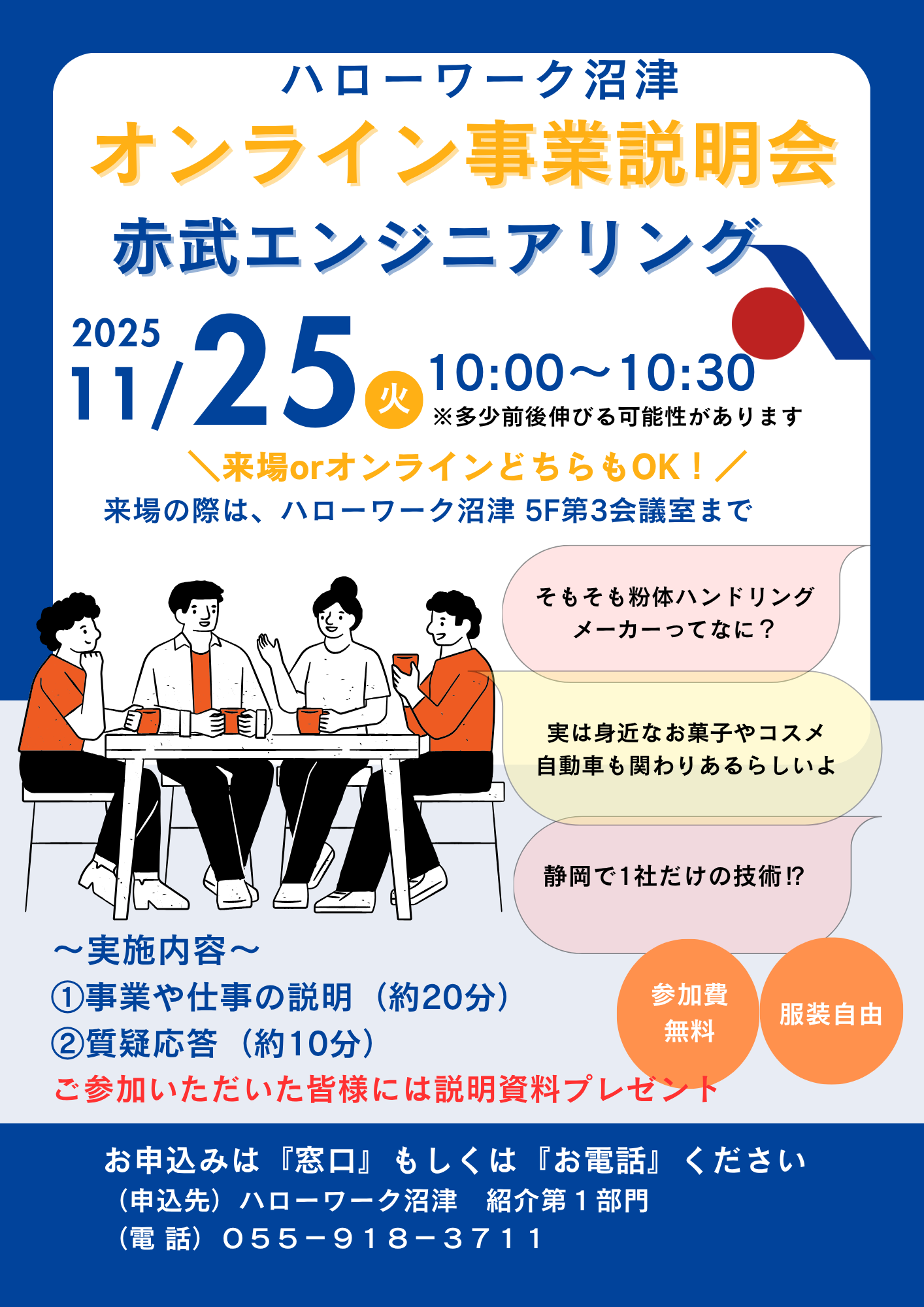2025年11月25日(火)にハローワーク沼津主催の「オンライン事業説明会」を実施いたします。